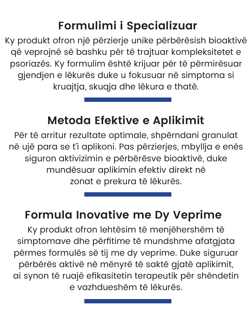 Psoreasy është një formulim i veçantë i krijuar për të përballuar kompleksitetet e psoriasis, e njohur zakonisht si dermatoza me lëkurë shkallore. Ky produkt përmban një përzierje të kujdesshme të përbërësve bioaktivë që veprojnë së bashku për të përmirësuar gjendjen e lëkurës. Formulimi trajton simptoma të ndryshme, duke përfshirë kruajtjen, skuqjen dhe shkarkimin e lëkurës, me qëllim për të rritur komoditetin dhe pamjen e përgjithshme.